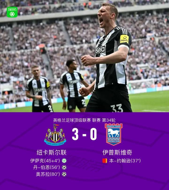 纽卡3-0十人伊普斯维奇,伊萨克、丹-伯恩、奥苏拉破门