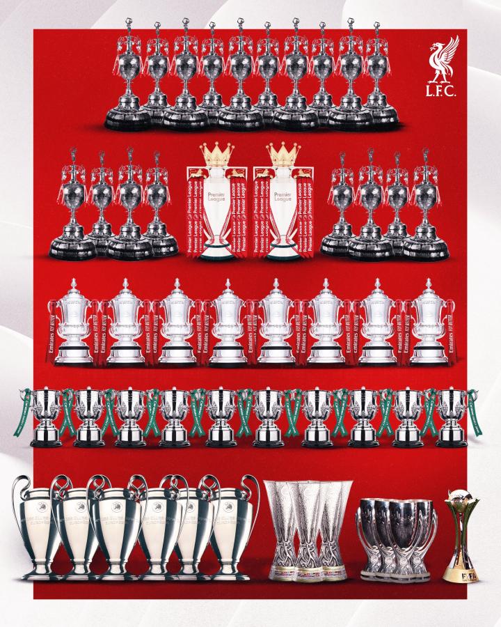 按照利物浦的评估,赢得英超联赛冠军将是他们的第52个重要奖杯。据他们计算,他们已经比曼联的 47 个奖杯总数多了4 个,所以这次夺冠将使他们在历史奖杯总数上领先5个。在两项最重要的赛事中,联赛冠军数他们将持平,而在欧冠冠军数上他们将领先 3 个。曼联的优势将仅限于足总杯和现已停办的欧洲优胜者杯。