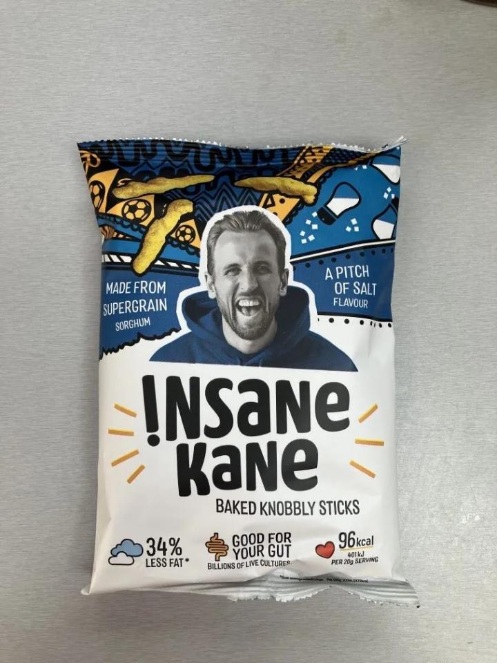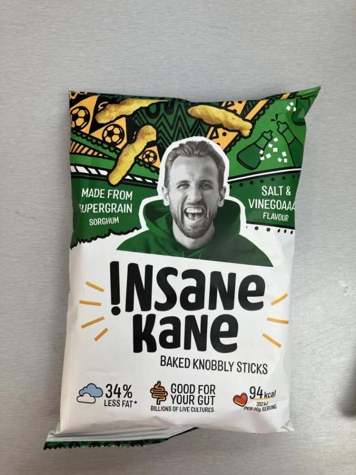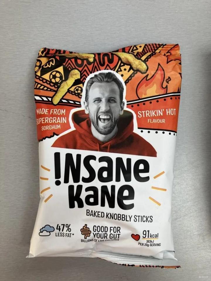 太阳体育的丹-金是一个比起了解足球更了解小零食的人,他对凯恩这次进军零食市场的尝试进行了品尝测试。这种与凯恩联名的高粱+玉米棒(类似奇多),还含有益生菌凝结芽孢杆菌,是品牌Insane Grain的特别版。