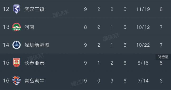 深圳新鹏城和武汉三镇,同样是降级的候选。两支球队丢球数排名中超前两位。其中深圳新鹏城队9场比赛丢了22球,脆弱的防线甚至比进攻“哑火”更加可怕,尤其是在遭遇保级生死战的时候,防守不稳将带来致命的问题。