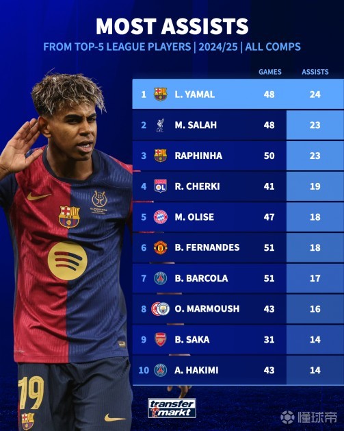 北京时间4月29日,德国转会市场公布了截至目前最新的助攻榜。巴萨新星亚马尔本赛季贡献24助领跑助攻榜,萨拉赫、拉菲尼亚各贡献23助位居次席。