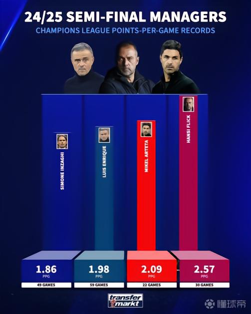 但当比较四位主帅场均得分时,弗里克则是以场均2.57分领跑。阿尔特塔位居第二,他以2.09分的优异成绩位居第二。这位西班牙人在阿森纳参加的欧冠比赛中,22场比赛中只输了4场,从未在酋长球场输过一场冠军联赛。恩里克在59场比赛中取得了场均1.98分的成绩位居第三。而因扎吉是这四位主帅中欧战场均得分最低的,只有1.86分。