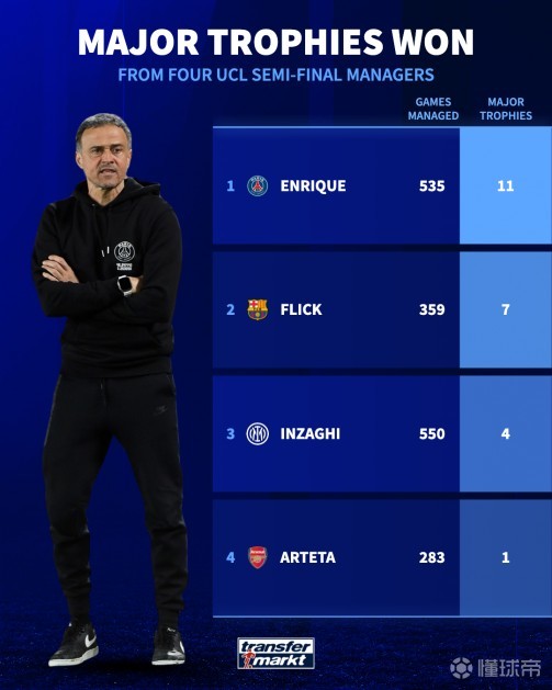 比较冠军荣誉时,恩里克则遥遥领先,在巴萨和巴黎任职期间,他赢得了11座重要比赛的奖杯,其中包括一座欧冠冠军奖杯。弗里克在拜仁和巴萨赢得了七座重要比赛的奖杯,包含1座冠军奖杯。因扎吉则赢得了4个重要比赛奖杯:3座国米获得的,1座拉齐奥获得。阿尔特塔只有一个主要的奖杯,就是2020年足总杯,而本赛季欧冠半决赛是截至目前阿尔特塔取得的欧冠最佳成绩。