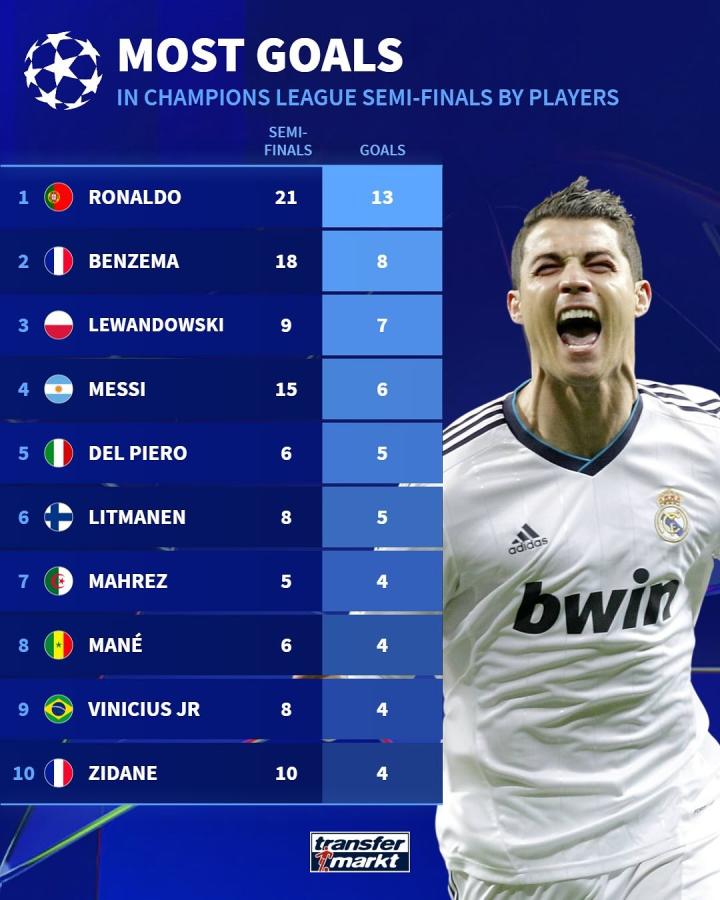 北京时间明天凌晨3点,24-25赛季欧冠半决赛首回合比赛将打响,赛前,德国转会市场列出了欧冠半决赛进球榜,其中C罗13球居首,本泽马、莱万、梅西等多人在列。