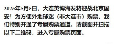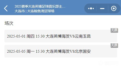 五一期间,大连英博将迎来接连两轮的联赛主场比赛。分别是5月1日中超第十轮英博vs云南,5月5日中超第十一轮英博vs国安。赛前,据大连英博官方购票平台显示,两场比赛的所有球票都已售罄。