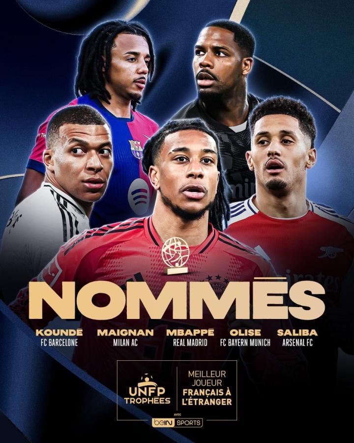UNFP(法国职业球员工会)公布了本赛季海外最佳法国球员候选名单,姆巴佩领衔,孔德、奥利塞、迈尼昂、萨利巴在列。