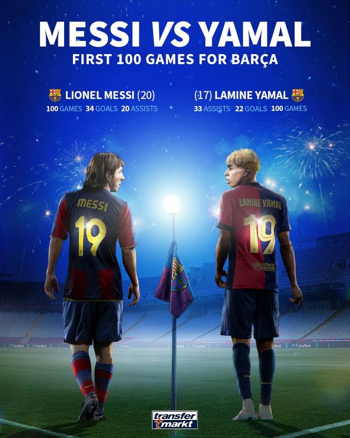 在与国际米兰的欧冠半决赛首回合比赛中,17岁的亚马尔达成了巴萨一线队生涯百场里程碑,并打入一球。德国转会市场网站对比了梅西和亚马尔巴萨生涯前100场的数据。