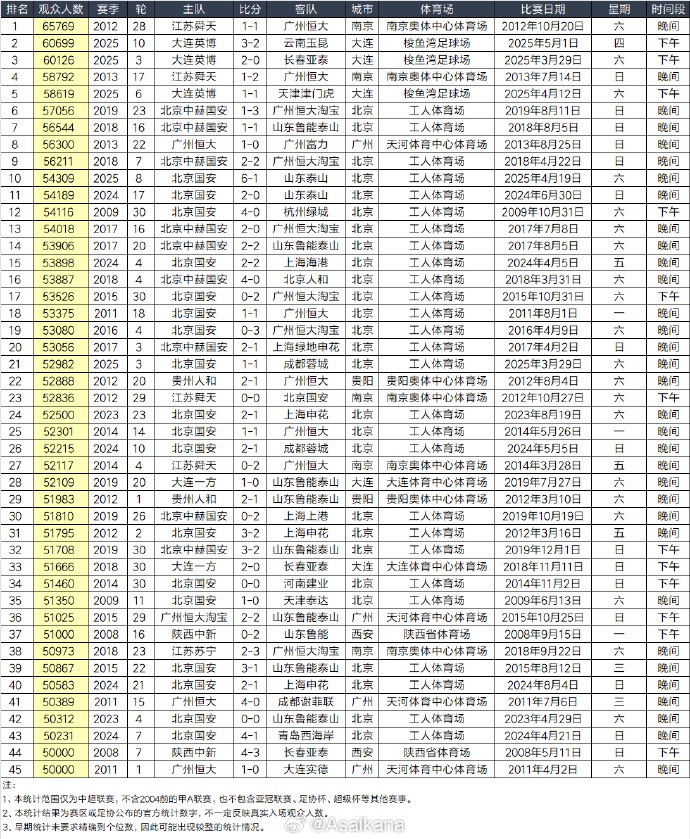 据朱艺统计,这一数据在中超历史上排名第二,仅次于2012年南京奥体江苏舜天vs广州恒大的65769人。这也是继那场之后中超联赛第三次有超过六万名观众现场观赛。至此,中超上座人数排行前五大连英博已独占3席。