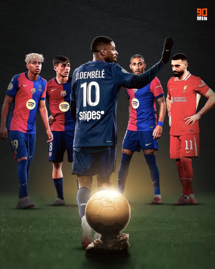 本赛季临近尾声,90MIN网站发布了一张海报,列出金球奖热门人选,从左到右依次是亚马尔、佩德里、登贝莱、拉菲尼亚和萨拉赫。