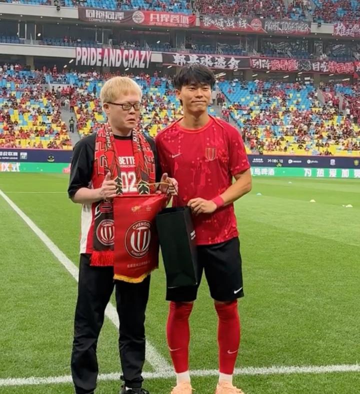 赛前还举行了青岛啤酒2025赛季荣誉球迷颁奖仪式,球员胡荷韬为视障球迷谭华颁发了“蓉城助威曲优秀创作球迷”奖。