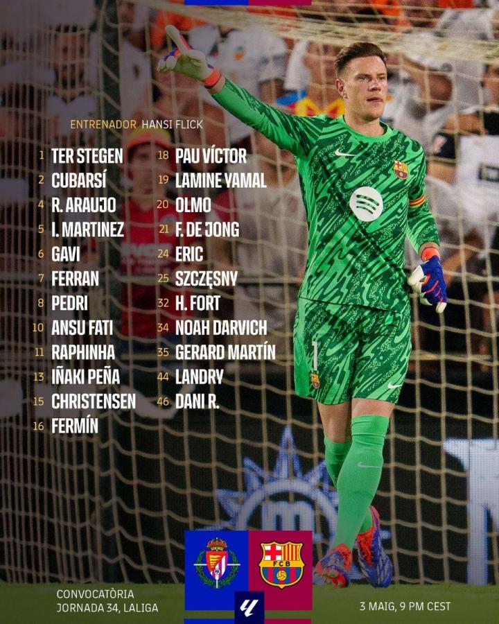 北京时间5月3日,巴萨公布了西甲第34轮客战巴拉多利德的球队大名单。亚马尔领衔,莱万和巴尔德因伤继续无缘大名单。