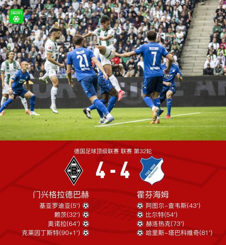 门兴4-4霍芬海姆,克拉马里奇助攻戴帽,克莱因丁斯特绝平