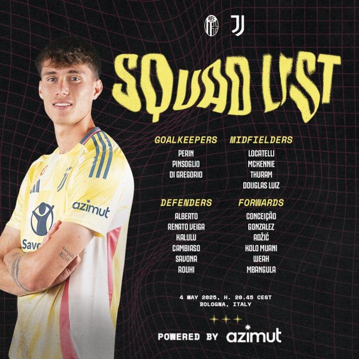 尤文图斯官方公布了意甲第35轮客场对阵博洛尼亚的比赛大名单,弗拉霍维奇、库普梅纳斯、劳埃德-凯利等人缺阵,伊尔迪兹因停赛缺席。比赛将于北京时间5月5日凌晨2:45进行。
