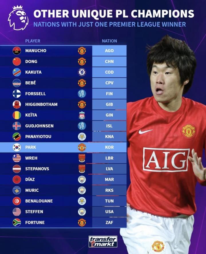 北京时间5月4日,德转列出了到目前为止只有一名英超冠军球员的国家或地区,其中包括了萨拉赫所代表的埃及、马内所代表的塞内加尔、贝尔巴托夫所代表的保加利亚、马赫雷斯所代表的阿尔及利亚、索博斯洛伊所代表的匈牙利、小豌豆所代表的墨西哥以及朴智星所代表的韩国,而中国则因为董方卓2006-07赛季曾代表曼联夺冠同样上榜。