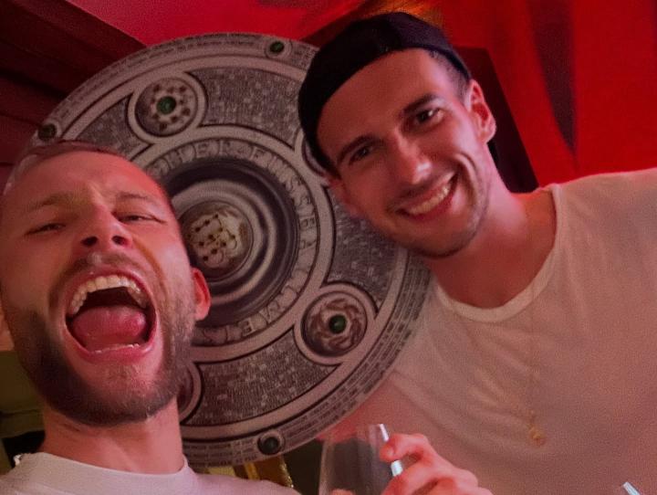 在拜仁提前夺得本赛季德甲冠军后,首次随队夺得德甲冠军的莱默尔在社交媒体晒出他和队友们在庆祝派对上的合照。