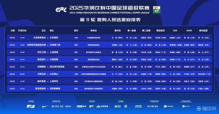 北京时间5月5日,中超第11轮裁判名单公布,马宁执法云南玉昆vs山东泰山,贺凯执法成都蓉城vs浙江。