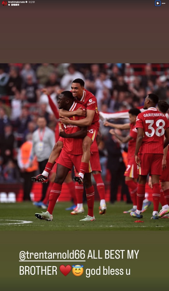 在阿诺德确认将在本赛季结束离开利物浦后,科纳特在社交媒体发文告别并送上祝福。