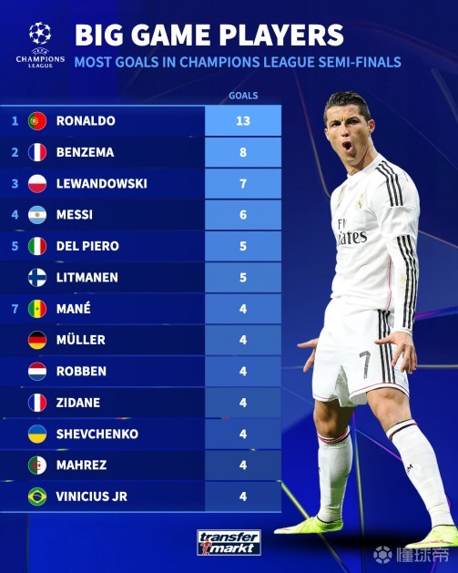 据统计,自1992/93赛季以来C罗是欧冠半决赛阶段进球最多的球员,此外,他也以140粒进球成为欧冠历史上的头号射手,他在代表皇马以及曼联的21场半决赛中攻入13球。