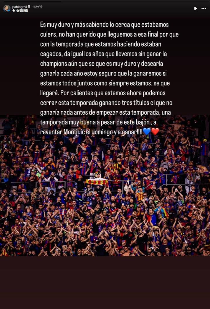 在周三凌晨进行的欧冠半决赛次回合比赛中,巴萨加时赛3-4不敌国米,赛后,加维在社交媒体上发表动态,谈到了自己对比赛的看法。