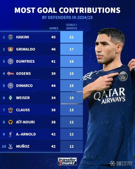 根据统计,本赛季到目前为止,阿什拉夫已经直接参与了21个进球,是本赛季参与进球最多的后卫。