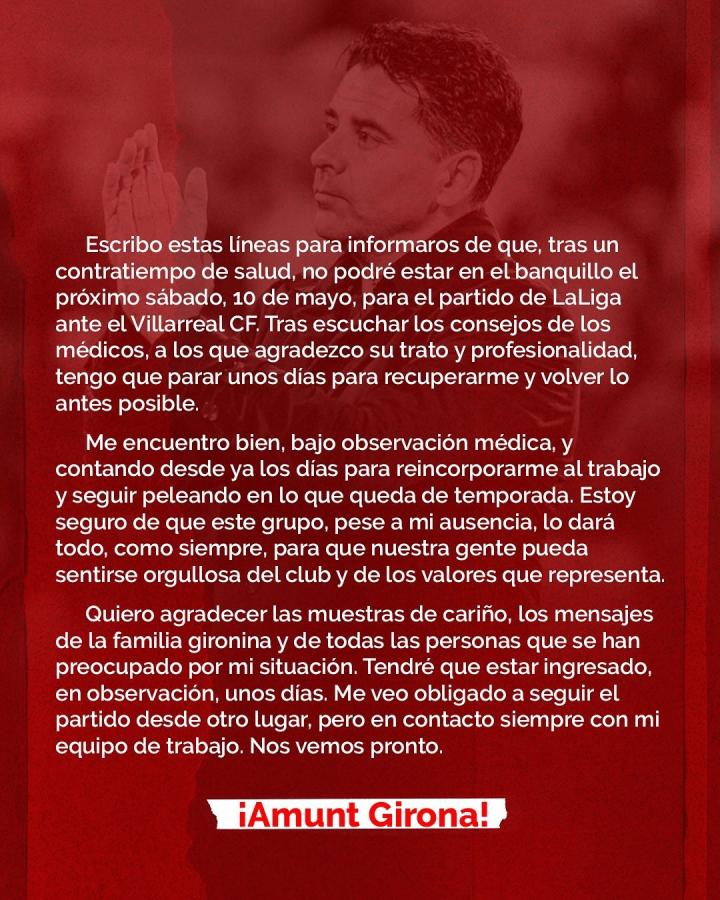 “我想感谢来自赫罗纳大家庭和所有关心我情况的人的关爱和支持,我需要住院并接受几天的观察,我将不得不在其他地方观看比赛,但会始终与我的工作团队保持联系,我们很快会再见面的。”