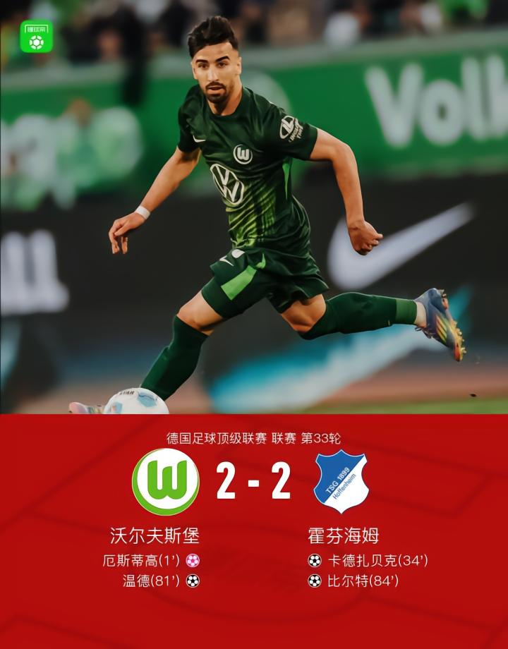 狼堡2-2霍芬海姆遭遇连续9轮不胜,温德破门,比尔特传射建功