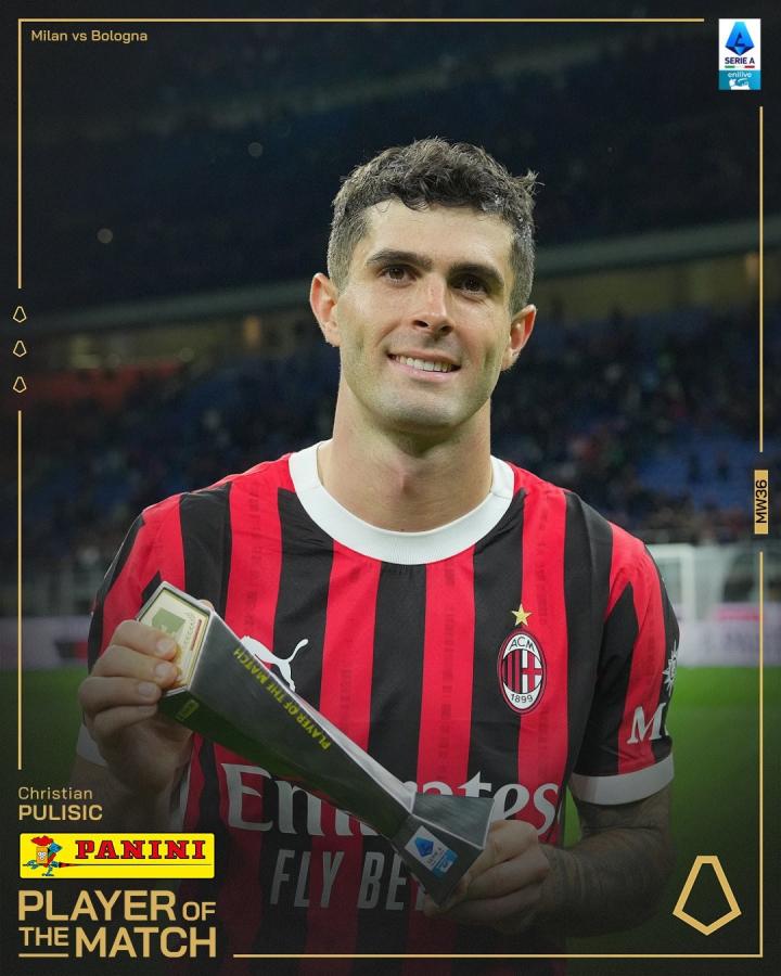 官方消息,普利希奇当选米兰对阵博洛尼亚一役全场最佳。