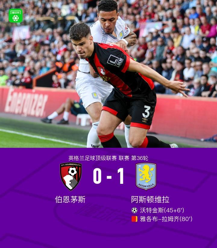 维拉1-0客胜伯恩茅斯,沃特金斯制胜,拉姆齐染红