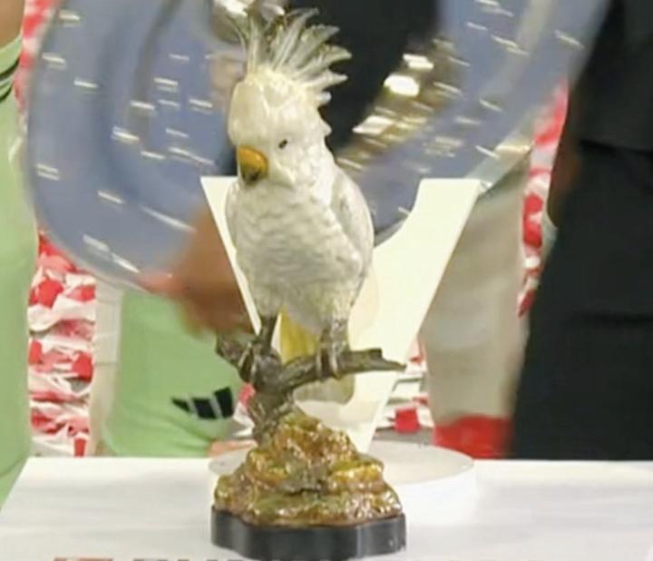 在举起奖盘之前,孔帕尼拿起了一只鹦鹉雕像并将其放在了之前放置奖盘的领奖台上。