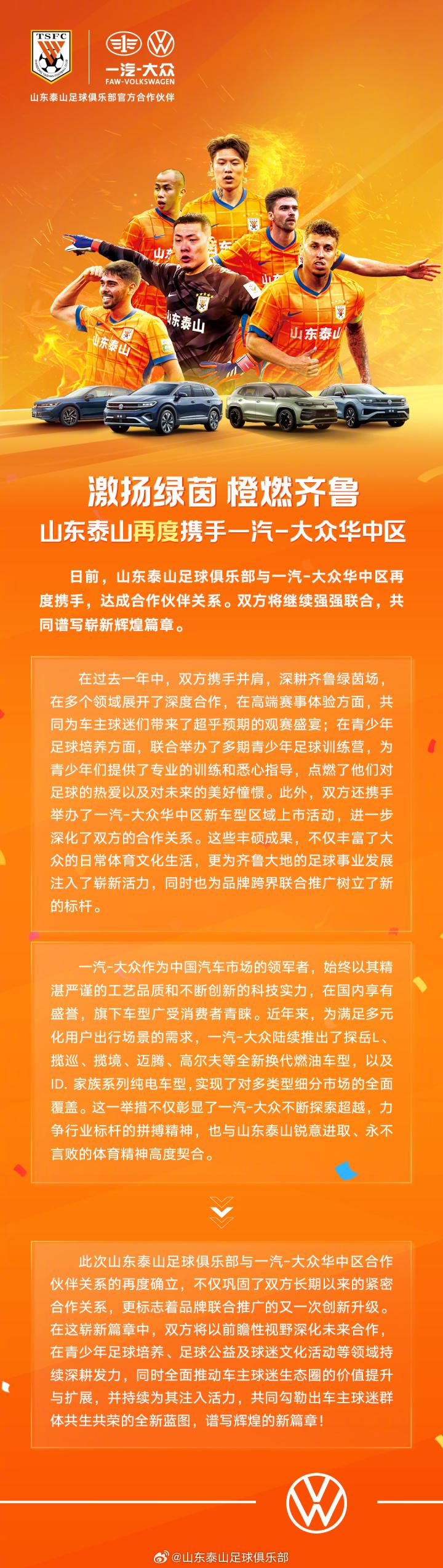 此次山东泰山足球俱乐部与一汽—大众华中区合作伙伴关系的再度确立,不仅巩固了双方长期以来的紧密合作关系,更标志着品牌联合推广的又一次创新升级。在这崭新篇章中,双方将以前瞻性视野深化未来合作,在青少年足球培养、足球公益及球迷文化活动等领域持续深耕发力,同时全面推动车主球迷生态圈的价值提升与扩展,并持续为其注入活力,共同勾勒出车主球迷群体共生共荣的全新蓝图,谱写辉煌的新篇章!