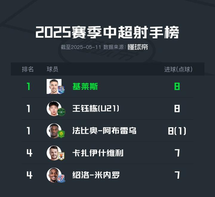 中超方面,本赛季表现出色的18岁小将王钰栋,为浙江队打入8粒进球,与基莱斯、法比奥共同领跑射手榜。