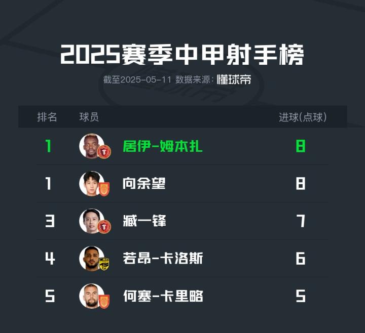 中甲方面,21岁的重庆铜梁龙队长向余望代表球队出场8次打入8球,与效力于辽宁铁人的外援姆本扎共同领跑射手榜。