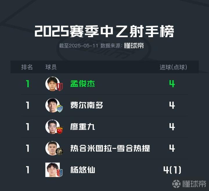 尽管中乙没有外援,但效力于成都蓉城B队24岁的孟俊杰、效力于广西恒宸23岁的费尔南多、效力于上海海港B队22岁的廖重九、效力于温州22岁的热合米图拉-雪合热提以及效力于广州蒲公英22岁的杨悠仙,这五位年轻小将仍各自打入4粒进球,共同领跑中乙射手榜。