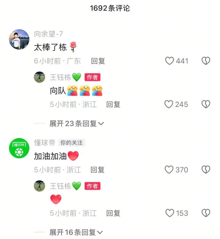 昨天晚上同样取得进球的申花小将刘诚宇以及重庆铜梁龙队员向余望也纷纷在社媒与王钰栋展开了互动。
