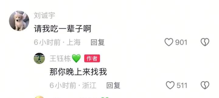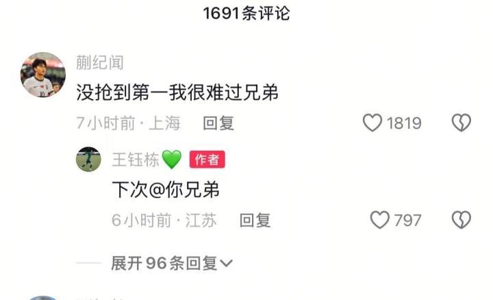 蒯纪闻在评论区表示:“没抢到第一我很难过兄弟。”王钰栋则回复到:“下次 @ 你兄弟。”