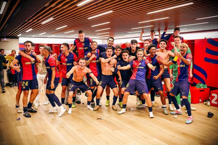 西甲第35轮国家德比,巴塞罗那主场4-3逆转击败皇家马德里,赛后,阿劳霍晒出全队更衣室合照庆祝胜利。