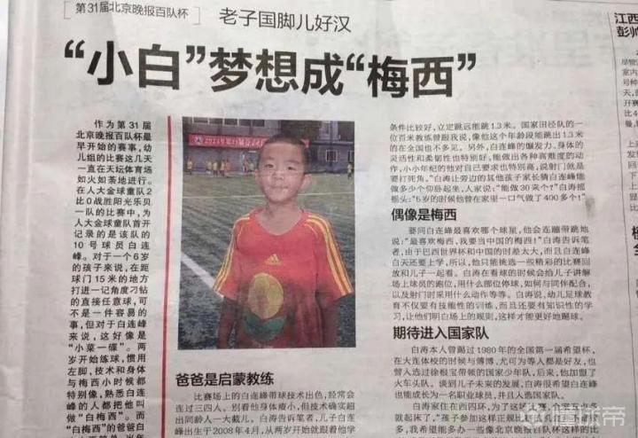 早在10年前,当时年仅6岁的白连峰就在北京地区举办的百队杯上有过不错的发挥。或许是遗传了爸爸的运动天赋,白涛表示儿子身体的爆发力、灵活性和柔韧性都特别好,5岁时就能一口气做400多个俯卧撑。那时候,在被问到自己的偶像时,白连峰大声说道:“最喜欢梅西,我要当中国的梅西!”