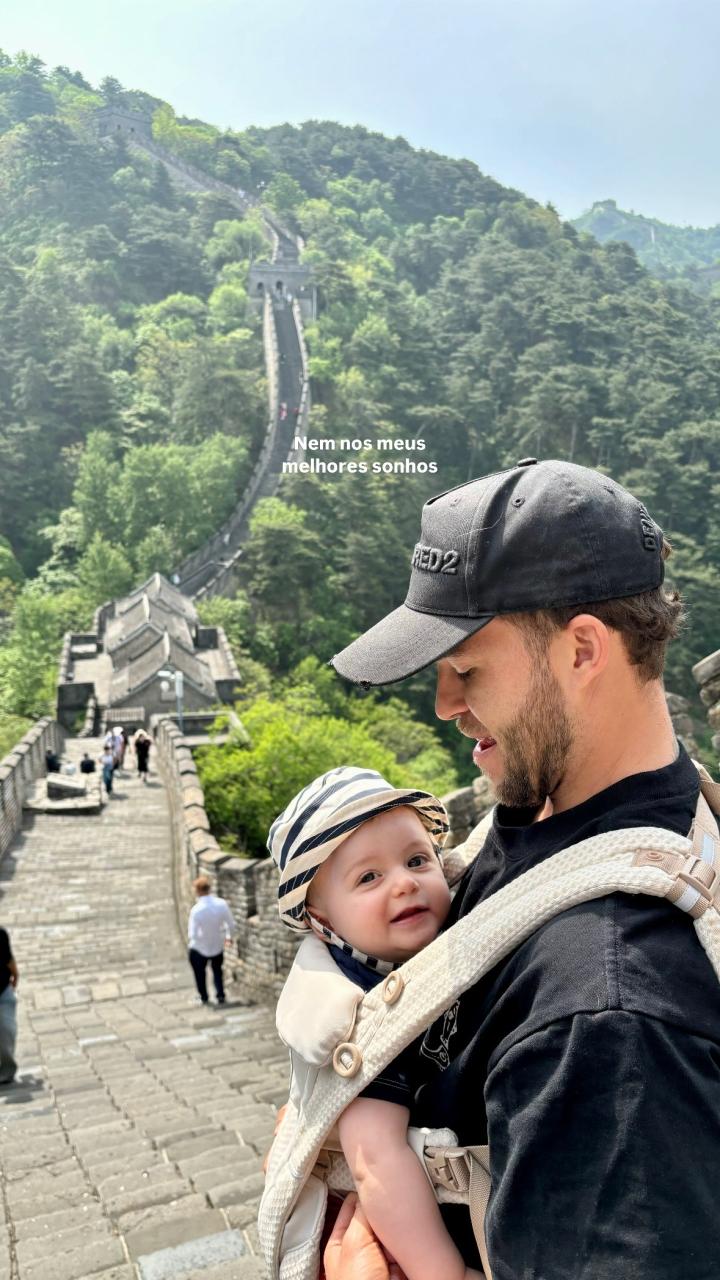 照片中,古加带着自己的孩子与妻子前往长城游览,上轮比赛中,古加的孩子还在工体现场看了球。