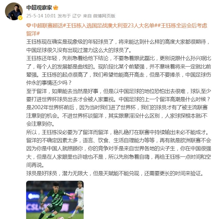 谈到有关浙江队小将王钰栋留洋的话题,博主“中超观察家”表示:“王钰栋没必要为了留洋而留洋,稳扎稳打在联赛中持续输出未必不能成才。”