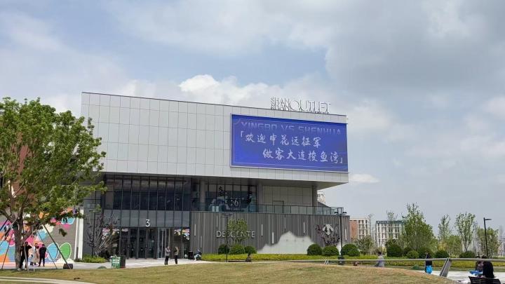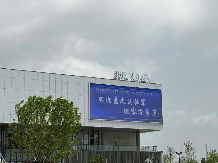 今晚6点,大连英博将坐镇中升梭鱼湾足球场对阵上海申花。赛前,梭鱼湾球场附近的商场外立面大屏展示了欢迎申花远征军的海报。