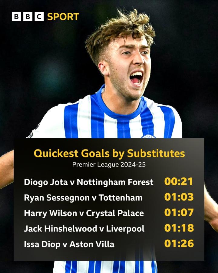本赛季英超替补登场后进球用时最快的五位球员分别是:迪奥戈-若塔(21秒)、瑞安-塞塞尼翁(63秒)、哈里-威尔逊(67秒)、杰克-欣谢尔伍德(78秒)以及伊萨-迪奥普(86秒)。