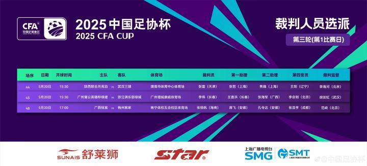 北京时间5月20日,足协杯第三轮第1比赛日的裁判名单公布,张雷执法陕西联合vs武汉三镇。