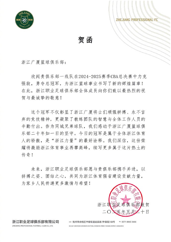 欣闻贵俱乐部一线队在2024-2025赛季CBA总决赛中力克强敌,勇夺总冠军,为浙江篮球事业书写了新的辉煌篇章!在此,浙江职业足球俱乐部全体成员向你们致以最热烈的祝贺与最诚挚的敬意!