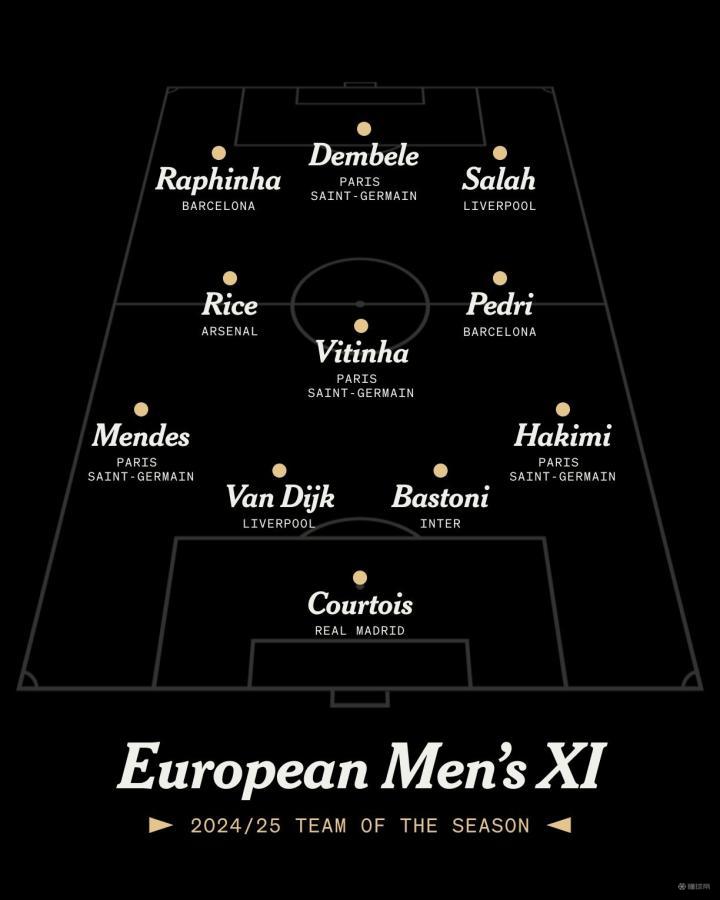后卫:努诺-门德斯(巴黎)、范戴克(利物浦)、巴斯托尼(国米)、阿什拉夫(巴黎)
