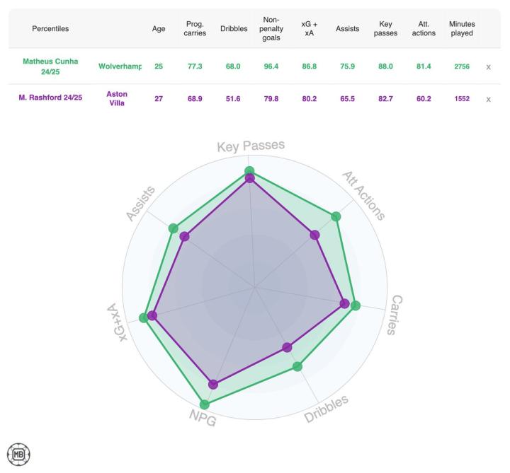 北京时间5月20日,数据网站 DataMB 发布了狼队前锋马特乌斯-库尼亚与阿斯顿维拉前锋拉什福德在2024/25赛季的表现对比数据,结果显示,库尼亚在多项关键进攻指标上均优于拉什福德。