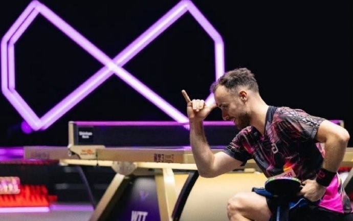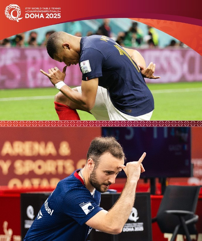 西蒙-高茨晋级多哈世乒赛男单十六强后做了姆巴佩的庆祝动作,去年他就做过一次。