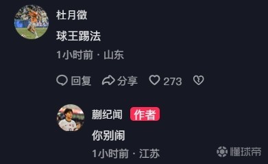 该动态评论区,蒯纪闻在U20国足的队友杜月徵留言夸赞:“球王踢法。”随后,蒯纪闻回复:“你别闹。”