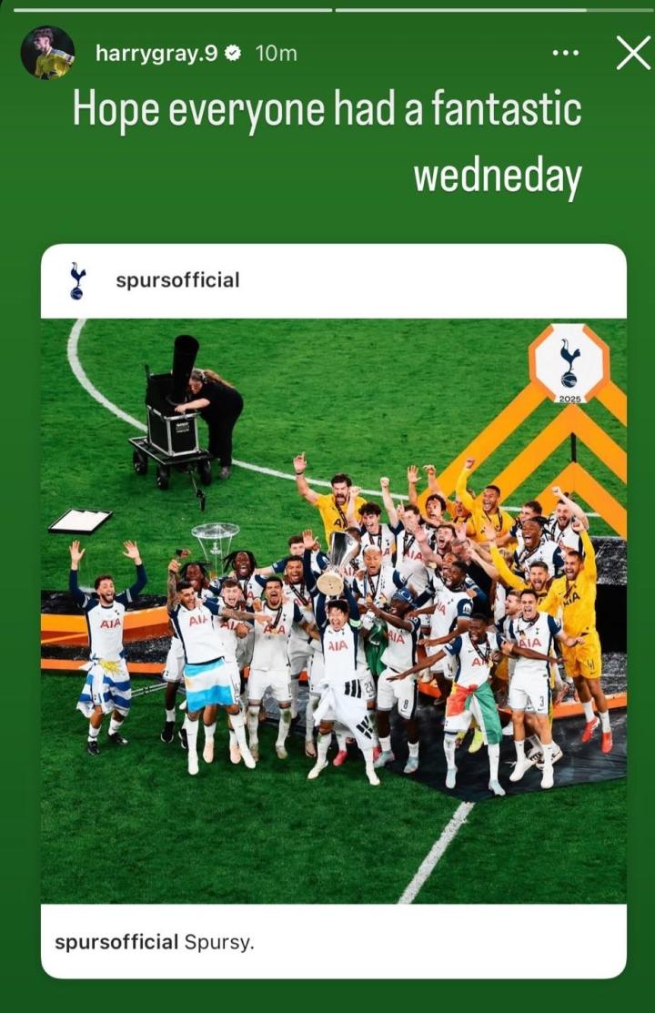 当地时间周三晚间,热刺击败曼联夺得欧联冠军,利兹联前锋哈里-格雷时隔一年截取热刺夺冠的庆祝图,并配文“希望所有人都有个美妙的周三”。
