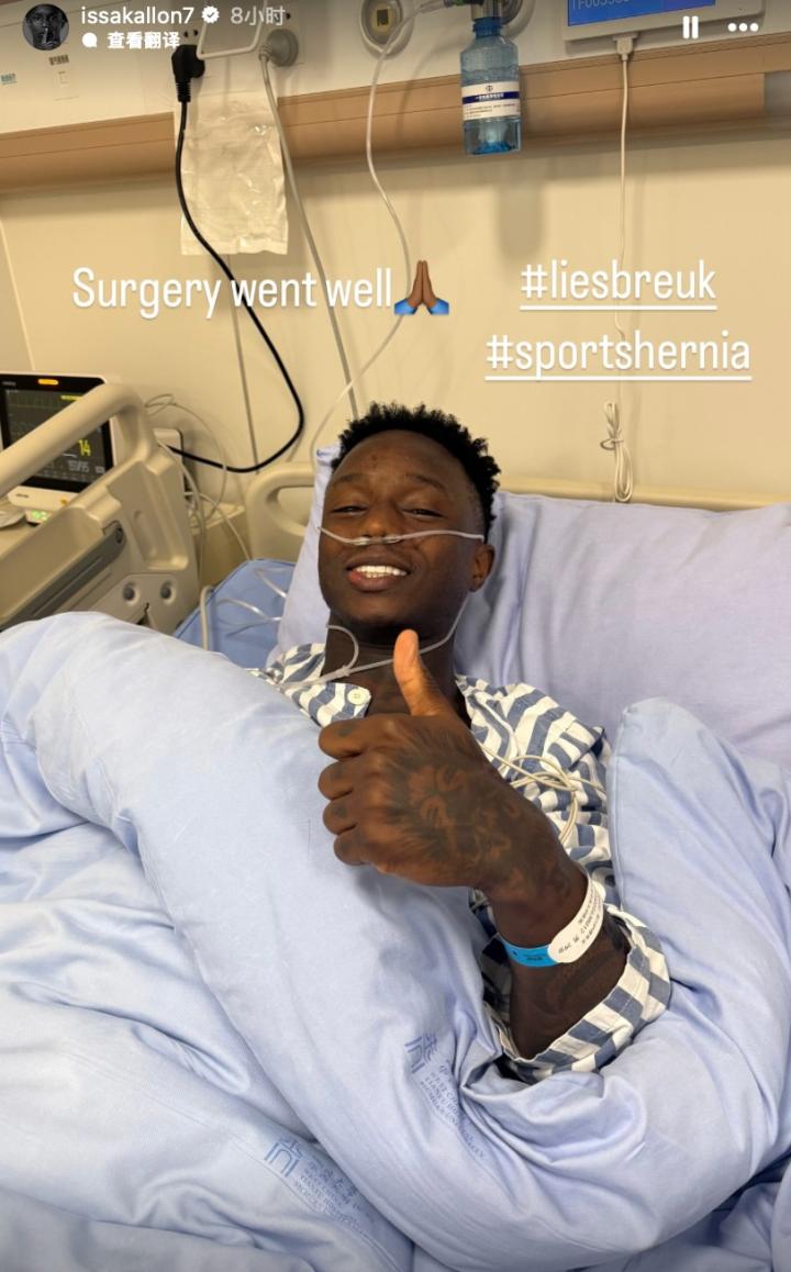 同时卡隆配文liesbreuk(荷兰语)和sportshernia(英语)两个单词,意味着他是进行了腹股沟的疝气手术。