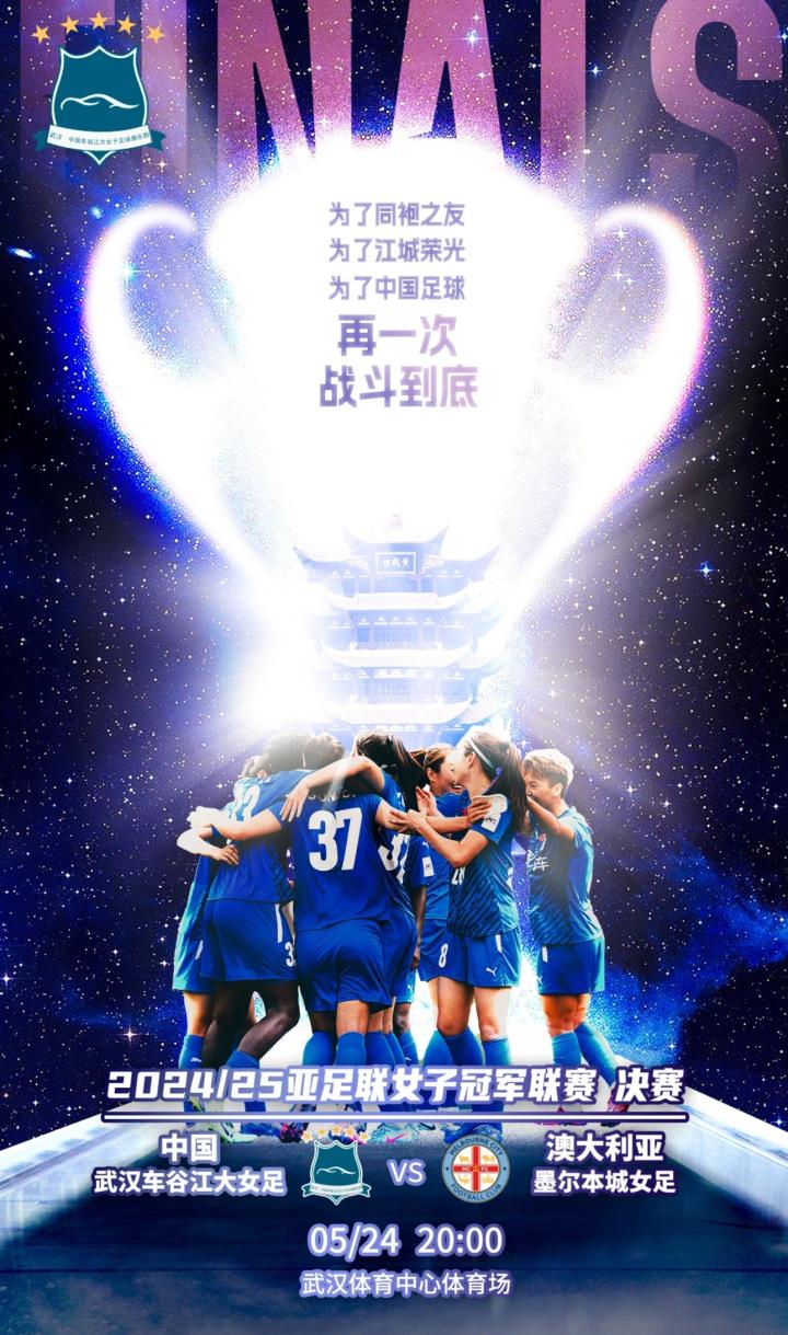 5月24日20:00,亚足联女子冠军联赛决赛,武汉车谷江大女足将坐镇武汉体育中心体育场与澳大利亚墨尔本城女足争夺冠军。